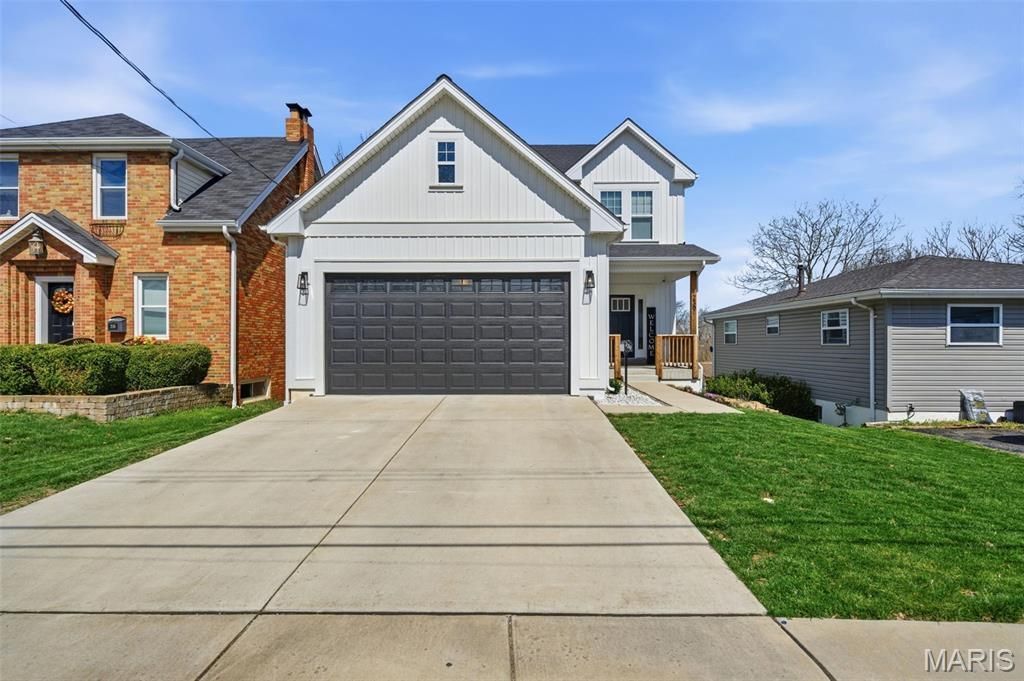 This 2021 Sunset Hills home in the Lindbergh school district offers over 2,000 sq. ft. of living space, plus an unfinished lower level with framing, a roughed-in bath, and egress for future expansion. Located near popular restaurants, great shopping, Laumeier Park, and Powder Valley Nature Center, the home features a modern color palette, wood floors, board-and-batten accents, and modern fixtures. The open-concept main floor includes a family room with a gas fireplace, built-in cabinets, and large windows. The kitchen is equipped with double wall ovens, a gas cooktop, a large center island, a custom backsplash, white shaker cabinetry, and quartz countertops. A laundry room with built in cabinets, pantry/storage room and a half bath complete the main level. Upstairs, you will find three bedrooms with ceiling fans and two full baths, including a primary suite with a tray ceiling, a walk-in closet with custom shelving, and a large bath featuring an oversized shower with dual shower heads and a heated floor. The exterior features a deck, a patio, a wood-fenced backyard, and a newer storage shed. Additionally, the two-car garage is finished with steel cabinets and interlocking tile flooring. Major systems are less than five years old, the seller is also providing a one-year American Home Shield Essential Policy. This property offers a functional layout and convenient access to HWYs 44 and 270.
